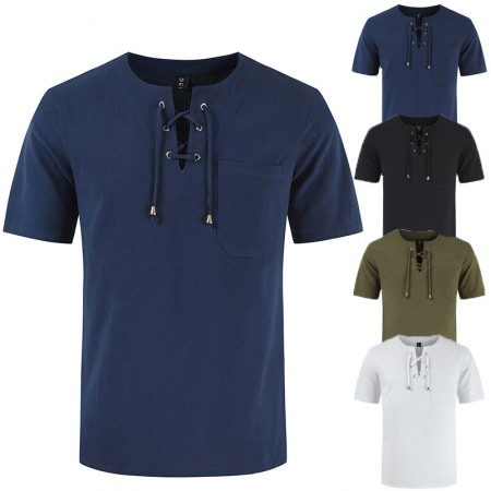 New Summer Men's Casual Mens Short-Sleeved T-Shirt Cotton and Linen Lace Casual Fashion T-Shirt